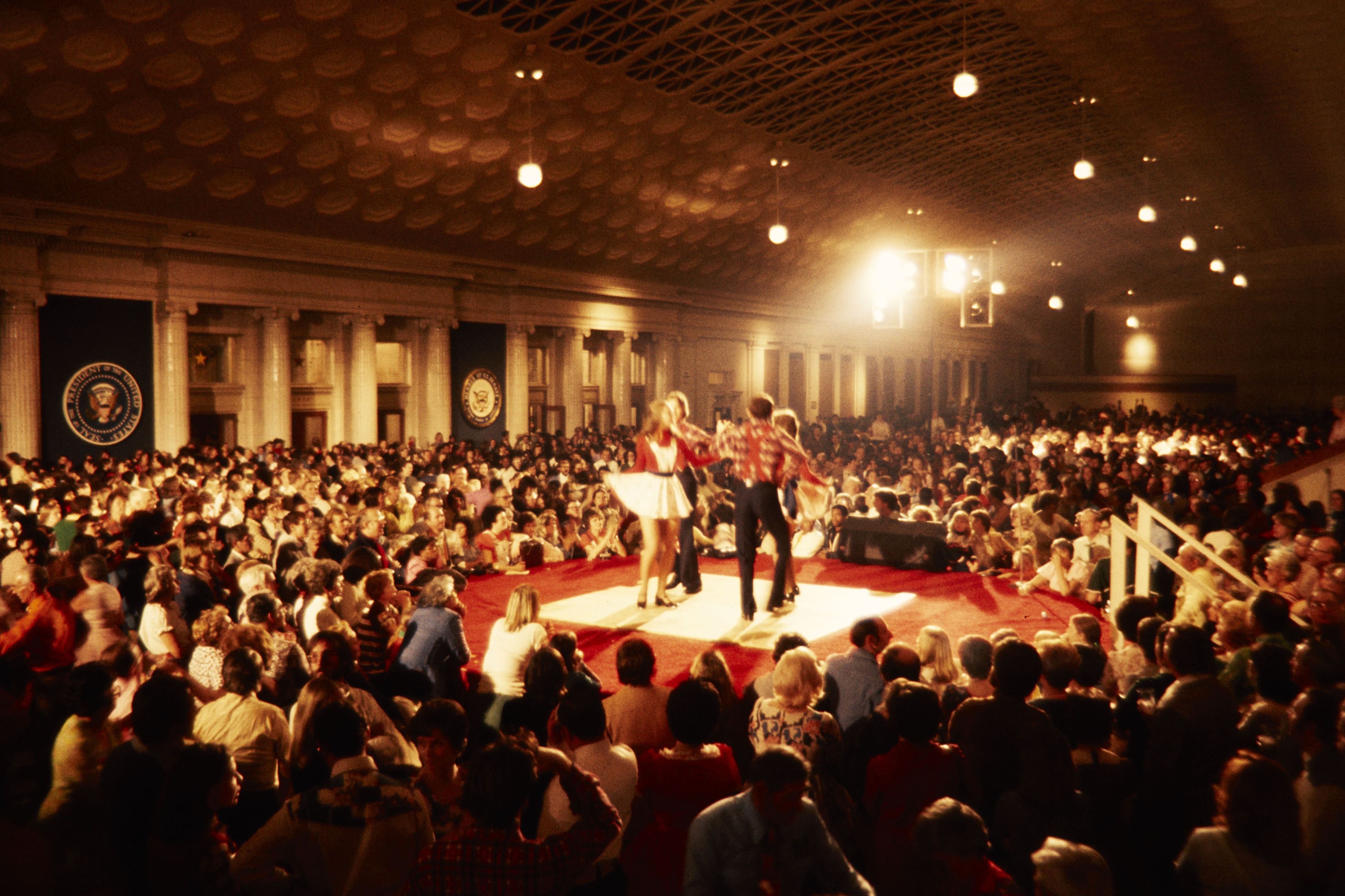 Dancers in square dancing costumes dancing on an elevated stage, surrounded by an audience in Union Station in Washington, D.C.