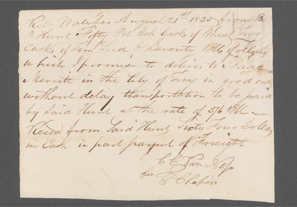 On front of document: “Recd Waterloo August 21st 1825 from R.P.Hunt Fifty Pot Ash Casks of Wheat Two Casks of Tim Seed & Seventy Bbls of Flour which I promise to deliver to Isaac Merritt in the City of Troy in good order without delay transportation to be paid by Said Hunt at the rate of 5/6 Bbl - Reced from Said Hunt Sixty Four Dollars in Cash in part paymt of Freight C C Van Ness for S. Chapin” On back of document: "S. Chapins Recpt for Wheat & flour"