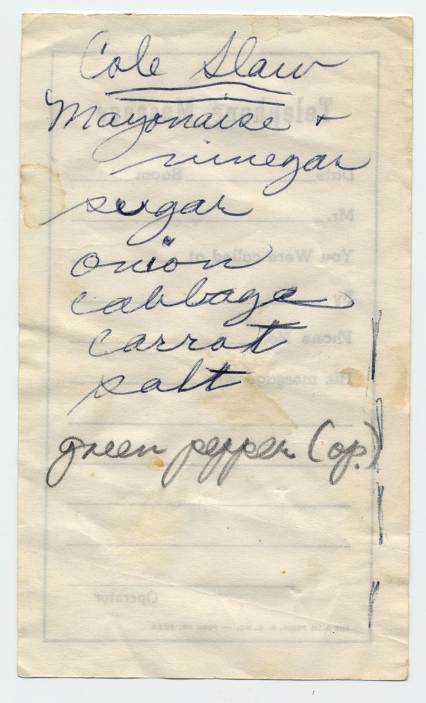 A recipe for Cole Slaw. The recipe is written on the back of a telephone message form and is part of Bess Truman's recipe collection.