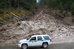 An NPS vehicle parked in the road in front of the wall of landslide debris, which towers behind it twice its height