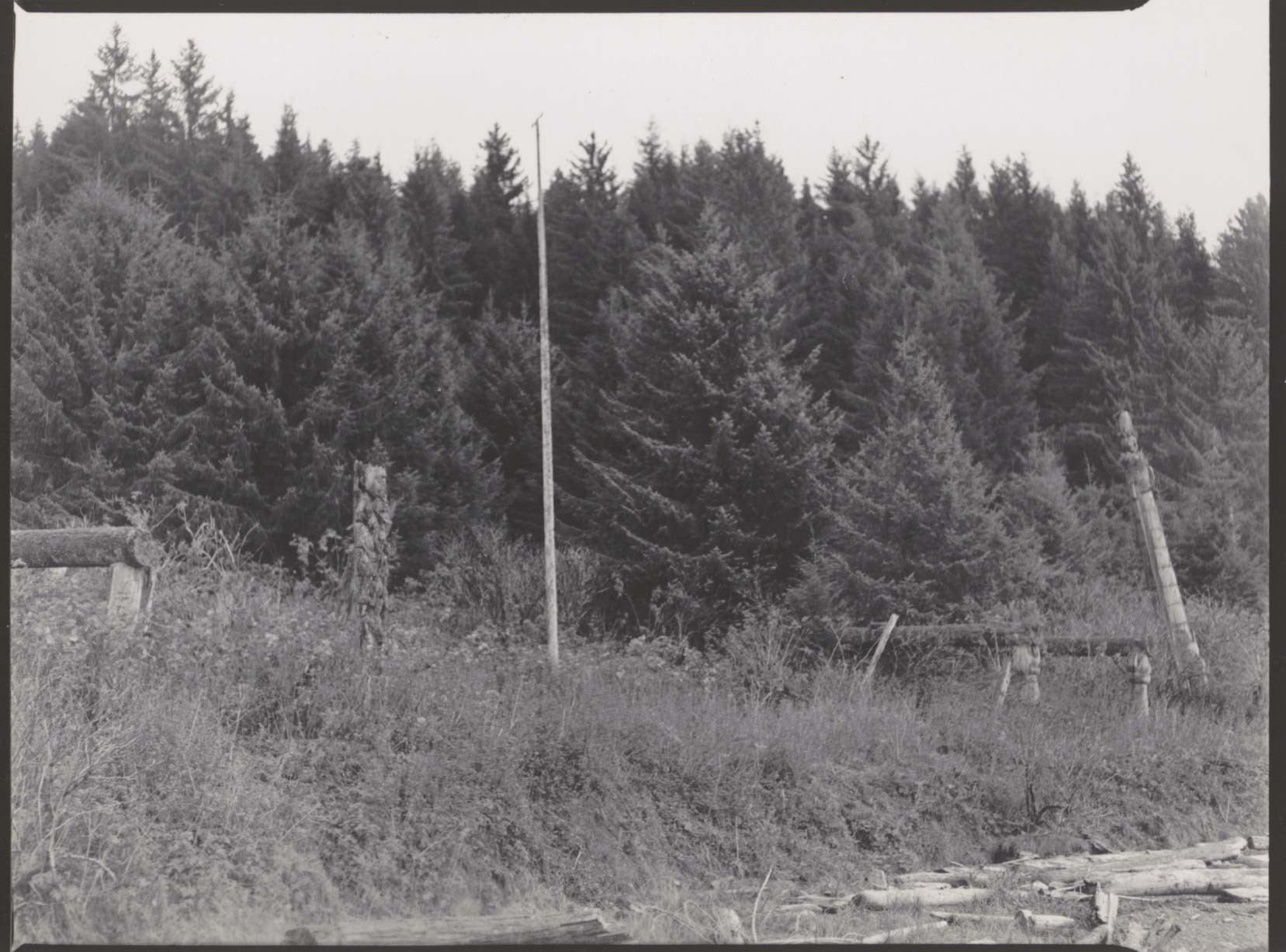 Portion of village east of center, from rocky point in front of village. Negative#: 10721. Location: Old Kasaan National Monument [Abolished], Alaska. Location of negative: Wildlife Division, Director’s Office. [This information comes from the reverse of the envelope for this negative number.].