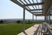 View looking out from modernist porch over green agricultural landscape