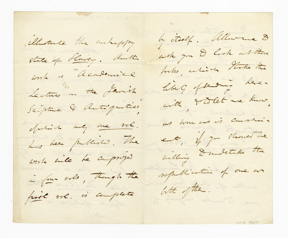 Athenaeum Club [pencil annotation in HWL Dana hand: London] Dec. 3d 1838 Dear Sir, [pencil annotation in HWL Dana hand: “[to Bentley, the British Publisher]”] Before leaving America my friends entrusted to me a couple of works, which they wished me to endeavor to get republished in England. One is a novel called The Slave, & the object of which is to [p. 2] illuminate the unhappy state of Slavery. Another work is “Academical Lectures on the Jewish Scriptures & Antiquities,” of which only one vol. has been published. The work will be comprised in four vols, though the first vol. is complete [p. 3] by itself. Allow me to ask you to look at these books, which I take the liberty of sending herewith, & to let me know as soon as is convenient, if you should be willing to undertake the republication of one or both of them. [p. 4] I have taken a great liberty in thus addressing you. My friend Mr. Hayward has given me a note of introduction, which is enclosed, upon the strength of which I have ventured to address you. My friend Mr. Longfellow, author of Outre Mer wished me to make inquiry of [p. 5] you with regard to the success, or failure of his book which you published a couple of years ago. I have the honor to be, Dear Sir Very truly yours, Charles Sumner [pencil annotation in HWL Dana hand:] “[MS bought by H.W.L. Dana, November, 1947 from Emily Driscoll for $5.00]”