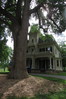 An ornate three-story house with decorative finishing, partly obscured by a tall, leafy tree with mulch around the base.