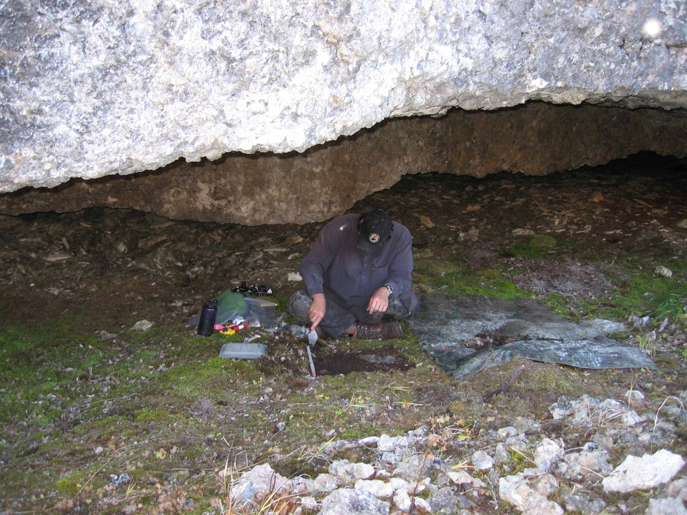An archeologist digs the first test pit at a site that may have prehistoric artifacts that could tell a story of people who passed through this area. The 50 cm x 50 cm excavation is the first of a few sample evaluations that will determine if a larger survey project is warranted.