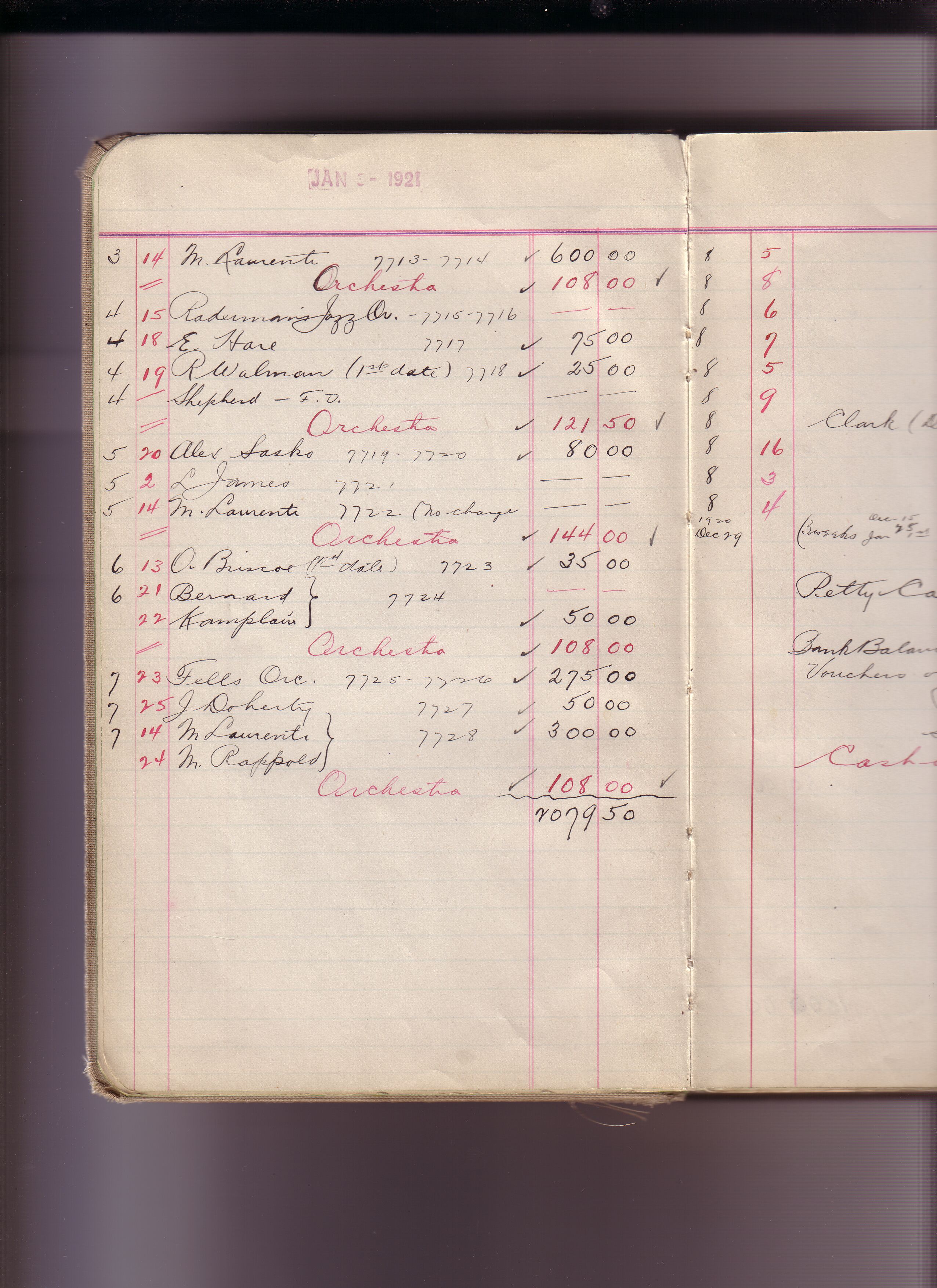 Thomas Edison's New York City Recording Studio Cash Book 17 (of 21), Image 06 (of 244). (Notebook #: PN-21-01-01, NPS catalog #: EDIS 1428), This book documents Diamond Disc matrices 7713 – 9183, expenditures for recording artist fees and other payments authorized by studio manager Walter H. Miller from January 03, 1921 – September 29, 1923. Digitally scanned December 2004 through July 2005 at resolution 300 dpi, 24 bit.