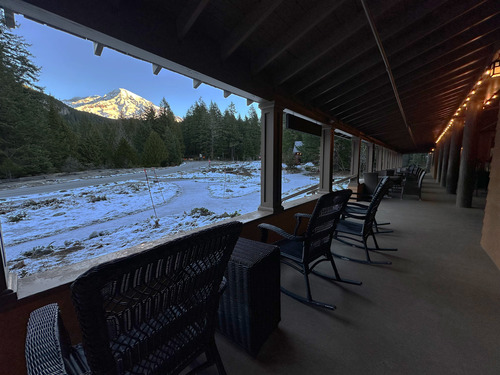 Enjoy a hot beverage and a view of Mount Rainier from the porch of the National Park Inn in Longmire.