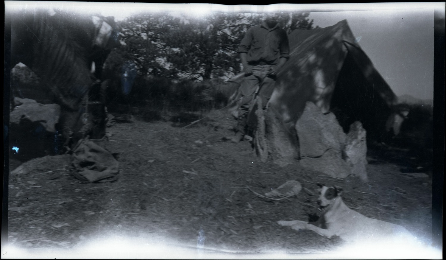Nitrate negative of man standing at campsite a dog and two horses. One horse wearing halter and eating from a feedbag. Other horse wearing a saddle strapped with gear. Canvas tent and fire ring. Location unknown. ; BRCA Museum and Archives Image BRCA8875_0