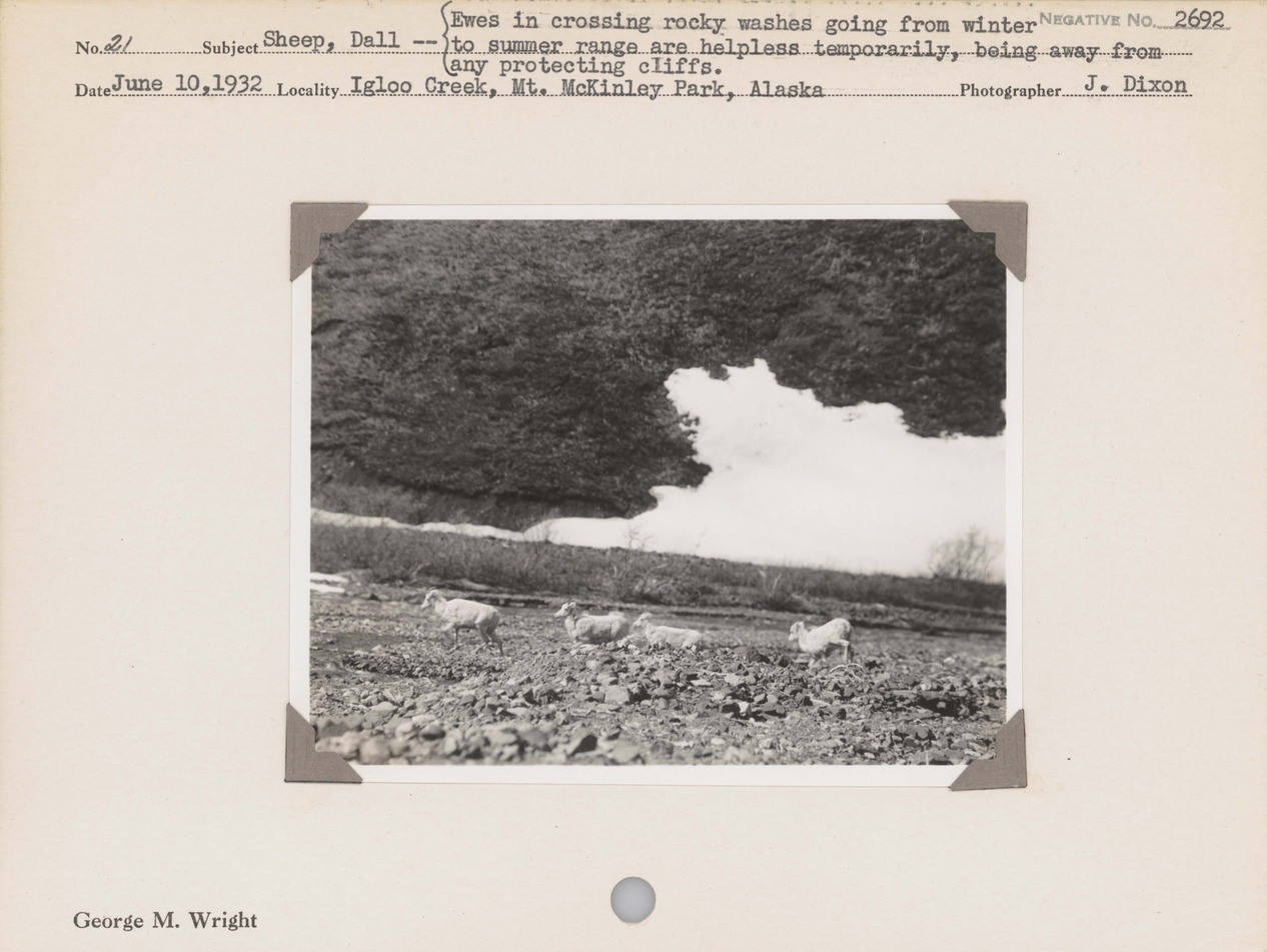 Sheep, Dall--Ewes in crossing rocky washes going from winter to summer range are helpless temporarily, being away from any protecting cliffs. Locality: Igloo Creek, Mount McKinley Park, Alaska [Denali National Park & Preserve]. Negative #: 2692