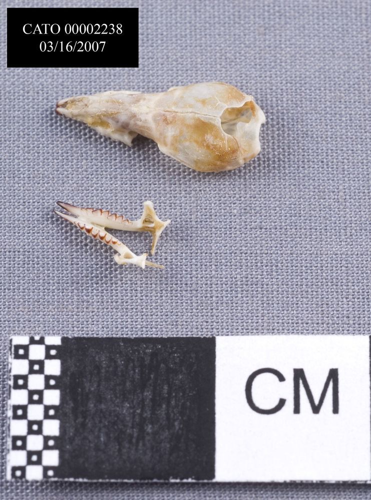 Microsorex hoyi,Pygmy shrew skin, 3" length, 3/8" wide. Light grey fur. Left front leg and right rear leg missing. Skull in seperate vial. Location ID CATO_F9<br>Field Number CJ04<br>Specimen ID 3450<br>Total length 75 mm<br>Tail length 28 mm<br>Foot 8 mm<br>Ear 1 mm<br>Weight 2.3 grams<br>Sex - Unknown<br>Age - Adult