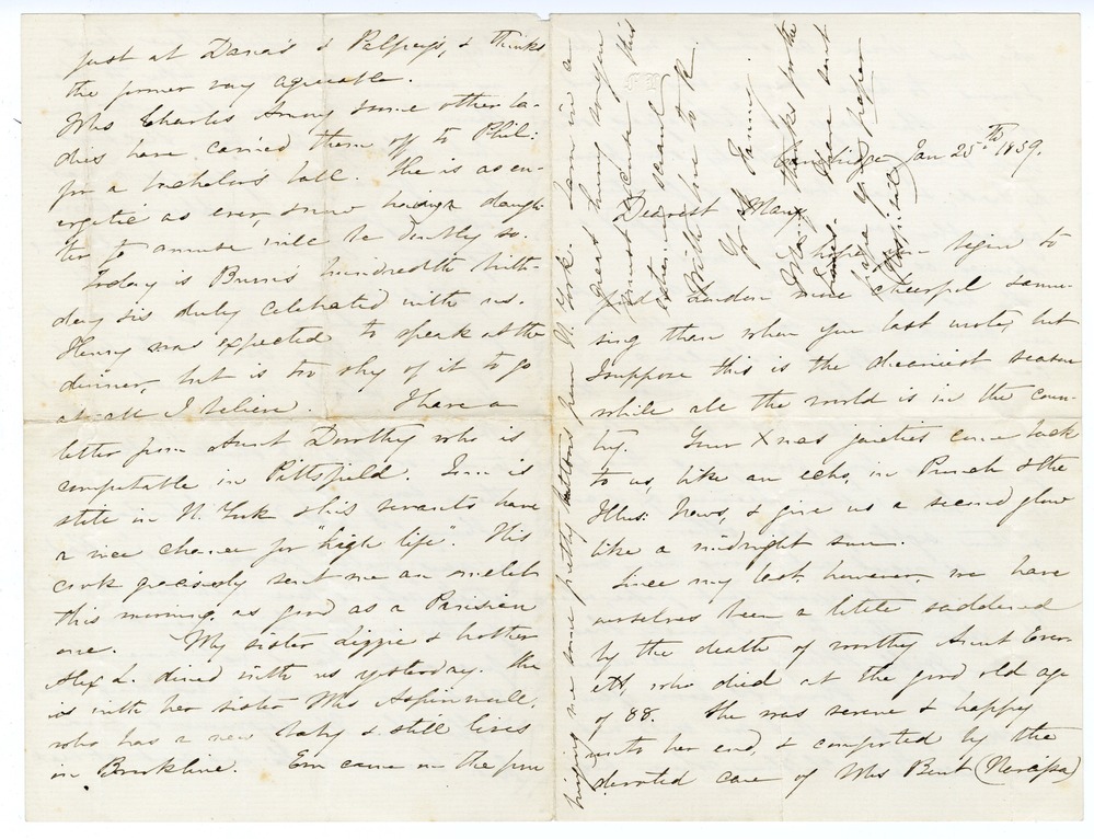 Today is Burns’ hundredth birthday & is duly celebrated with us. Henry was expected to speak at the dinner, but is too shy of it to go at-all I believe. I have a letter from Aunt Dorothy who is comfortable in Pittsfield. Tom is still in N. York & his servants have a nice chance for “high life”. His cook graciously sent me an omelet this morning, as good as a Parisian one. My sister Lizzie & brother Alex L. dined with us yesterday. She is with her sister Mrs Aspinwall, who has a new baby & still lives in Brookline. Em came in the pm [p. 1 cross] bringing me some pretty buttons from N. York. I am in a great hurry so you must excuse this extreme scrawl