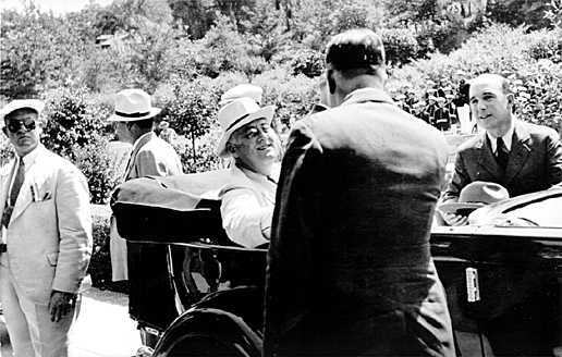 Postcard image of President F. D. Roosevelt at Hot Springs National Park. At far right is Thomas J. Allen,Superintendent, Rocky Mountain National Park. With his back to the camera is Donald S. Libbey, Superintendent, Hot Springs National Park. Postcard has hand-written date on back in pen.