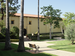 The front of a white mission building with a Spanish-style tiled roof opens to a courtyard garden with mature palm trees, a concrete walkway, and a bench