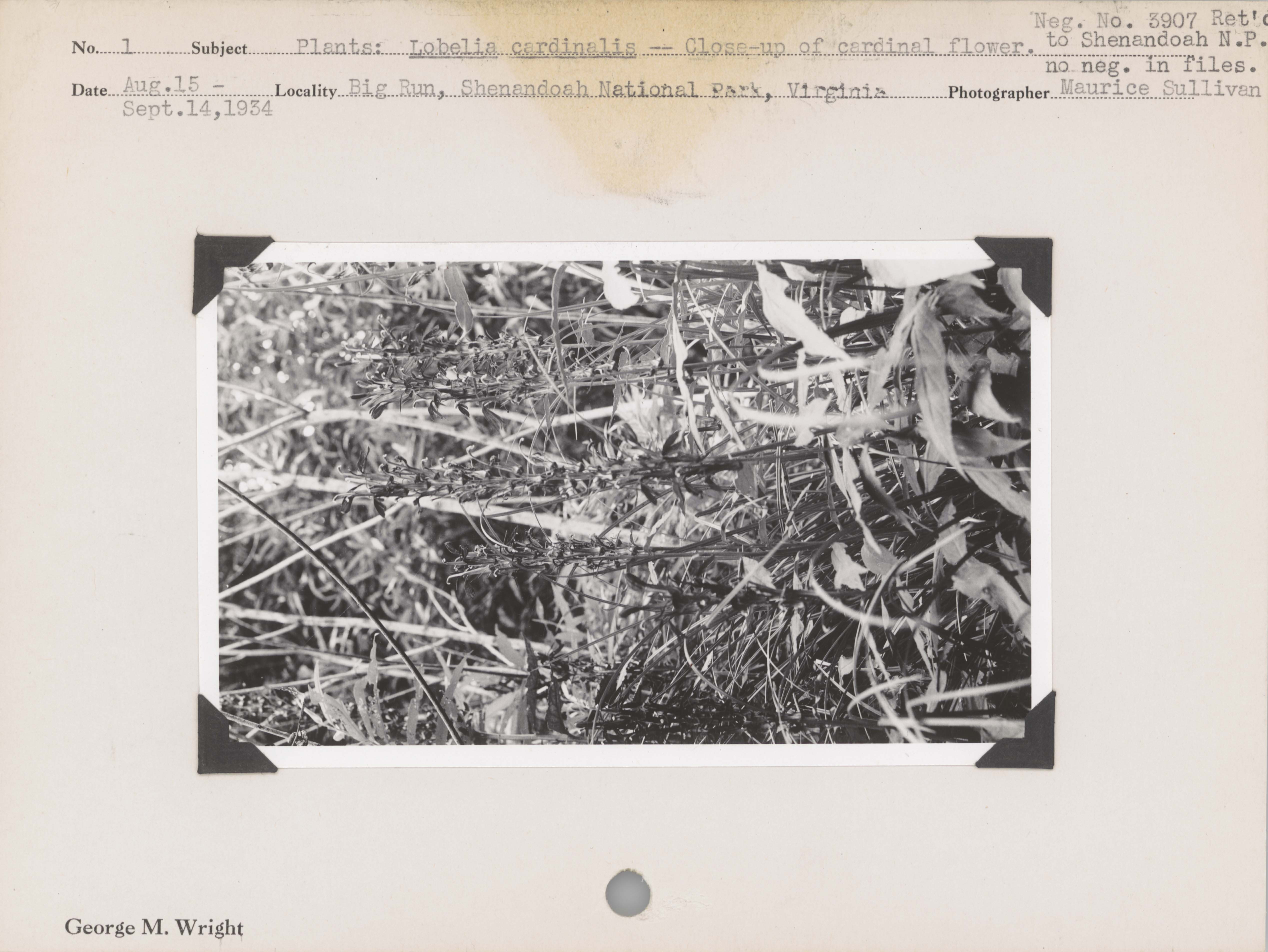 Plants--Lobelia cardinalis--Close-up of cardinal flower. Locality: Big Run, Shenandoah National Park, Virginia. Negative #: 3907. Negative returned to Shenandoah National Park. No negative in files. August 15-September 14, 1934