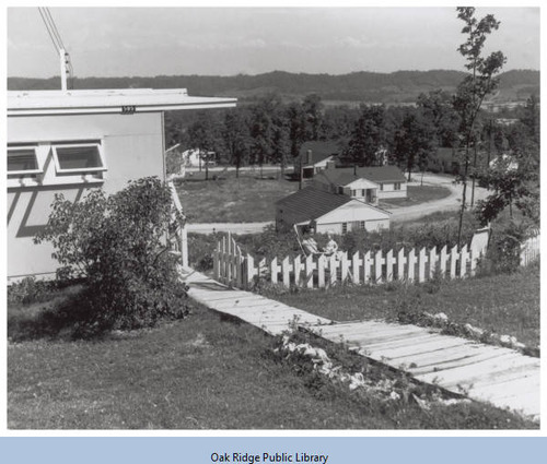 A woman and a child are sitting in a fenced yard of a flattop house in Oak Ridge, TN. Other houses are in the distance.