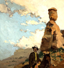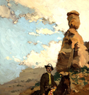 John Otto at Balanced Rock. Portrait features illustrated after photographs of John Otto and landscape profiles from reference photographs of Balanced Rock.