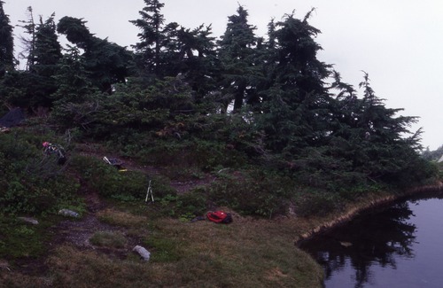 Cascade Pass, Revegetation Site TH36, revegetation monitoring photograph. Text on slide frame reads: "REV/CAS/TH36/b-12, See Thornburgh figure 11 (p. 15) Cascade Pass/Mix-up Arm tarn and impacts Thx36/Thx37, 8-6-03." (North Cascades NPS Complex Museum Collection, NOCA.0013 Revegetation Program Records, Series XI: Photographs, File 001 - Cascade Pass, Vicinity Impacts and Revegetation Sites, 1970-2004)