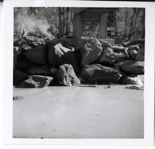Protection/stabilization of the footings for the old Birch Creek suspension footbridge. ; ZION Museum and Archives Image 005.06.03-1of7 ; ZION 15933