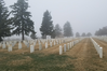 Unsaturated ambient light illuminates a cemetery with rows and rows of marble textured gravestones. Somber conifers and a few deciduous trees intermingle with the graves and form a back border. The vague outline of the library building can be seen between the trees in the distance.