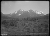A muskeg, looking east towards mountains. Numerous short evergreens dotted throughout the muskeg.