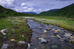 A creek flowing through a field with rocks peeking out.