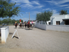 A group of people wearing Spanish colonial costume on horseback ride down a gravel road past a white stucco building