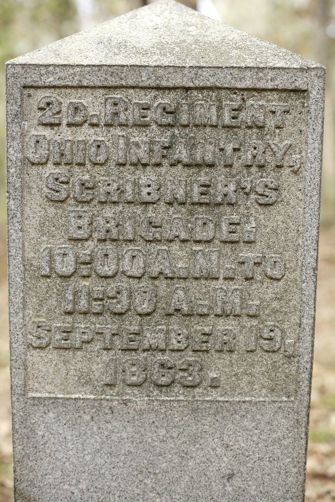 Marker contributes to nat'l significance of park under NR Criterion A because it represents the national movement among veterans & related groups to commemorate Civil War battlefields. || A 1'6" x 1'6" x 3' high granite obelisk with a raised letter inscription. Marks regiment's position at the northeast of Winfrey Field on September 19, 1863, from 10:00 to 11:30 a.m.