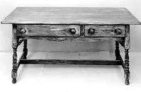 "Antiqued" kitchen table, pine reproduced in shop at Colonial -- on exhibit in Swan Tavern Kitchen Museum. Yorktown, Virginia. Colonial National Historical Park.