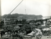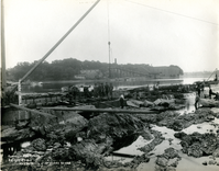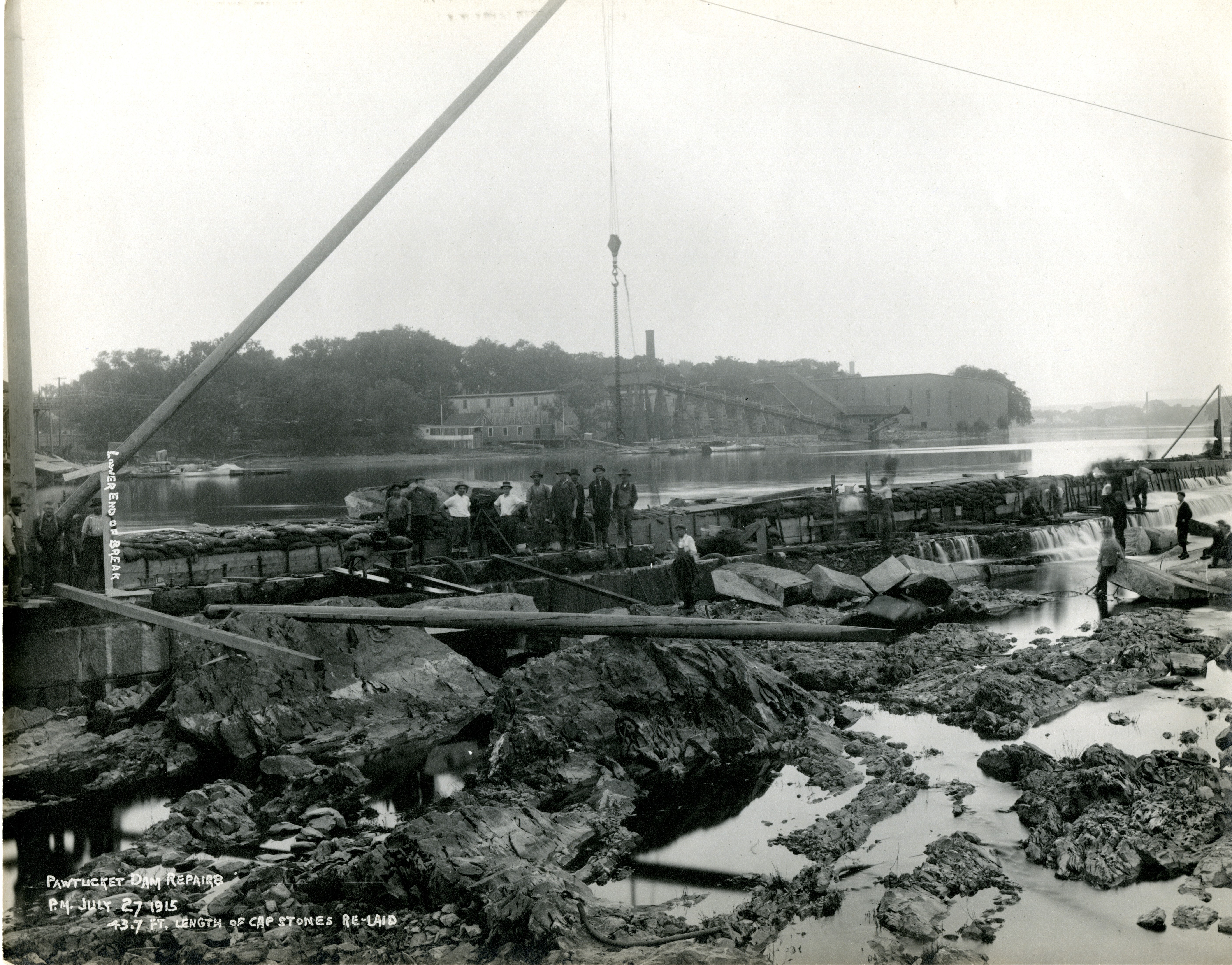 It is late in the day and workers pose for the camera. After 10 days of work, repairs are progressing. An annotation on the photo shows where the repair work began. At the left of the photo on the bank of the river is the Lowell Motor Boat Club wharf where a club member experienced the sudden drop of the river when the dam failed.