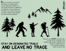 Infographic with text reading "Stay on Designated Trails and Leave No Trace. Each of us plays a vital role in protecting our national parks. As we spend time outdoors, in the natural world and in wilderness, it's important to be conscious of the effects our actions may have on plants, animals, other people, and even entire ecosystems. there are over 21,000 combined miles of trails for you to explore in the National Park Service. Whether you're looking for rugged slopes or a flat, smooth boardwalk, there's a trail for you!" Illustration includes two hikers near a mountain and trees being followed by a Sasquatch.