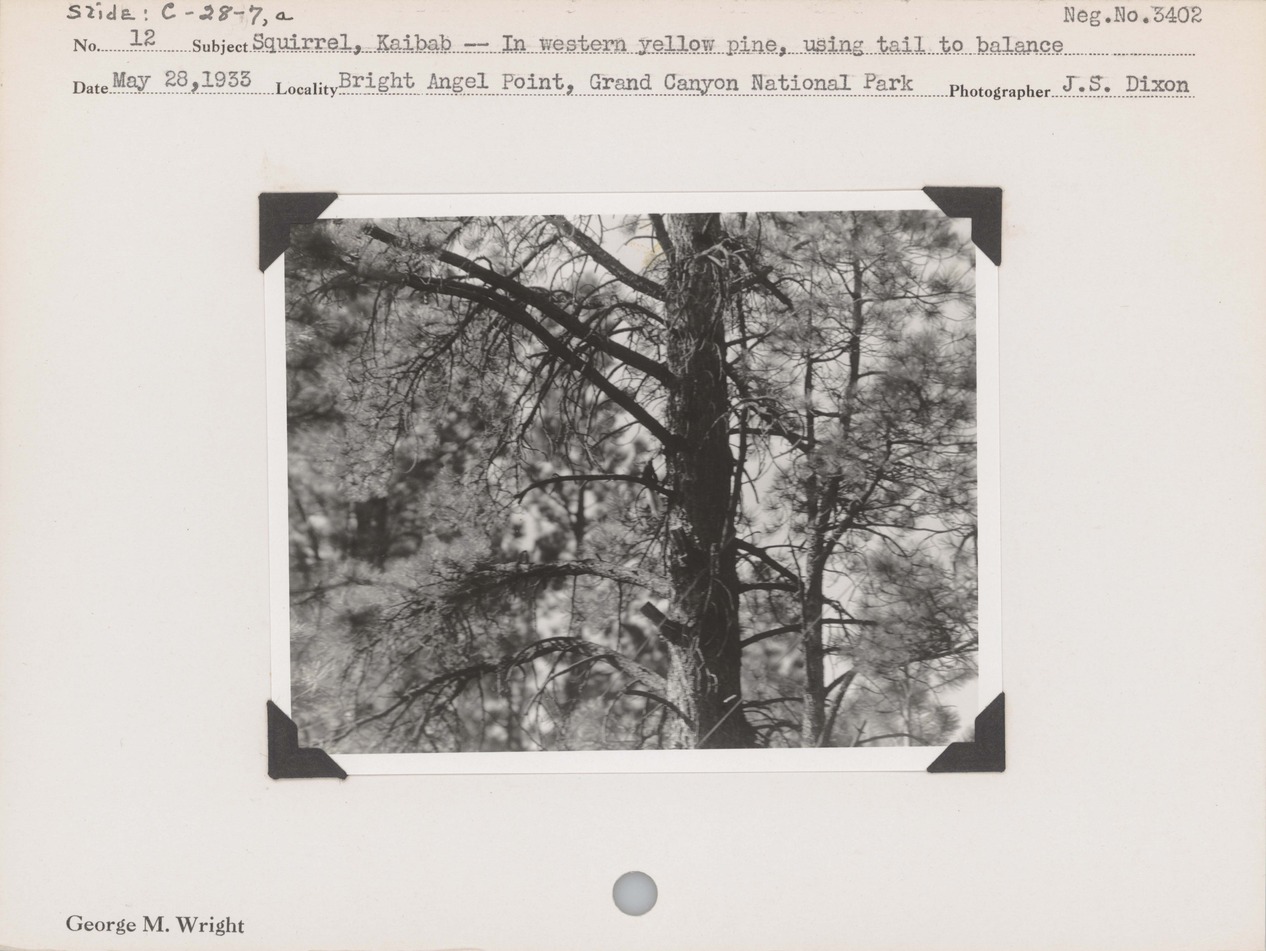 Squirrel, Kaibab--In western yellow pine, using tail to balance. Locality: Bright Angel Point, Grand Canyon National Park. Negative #: 3402
