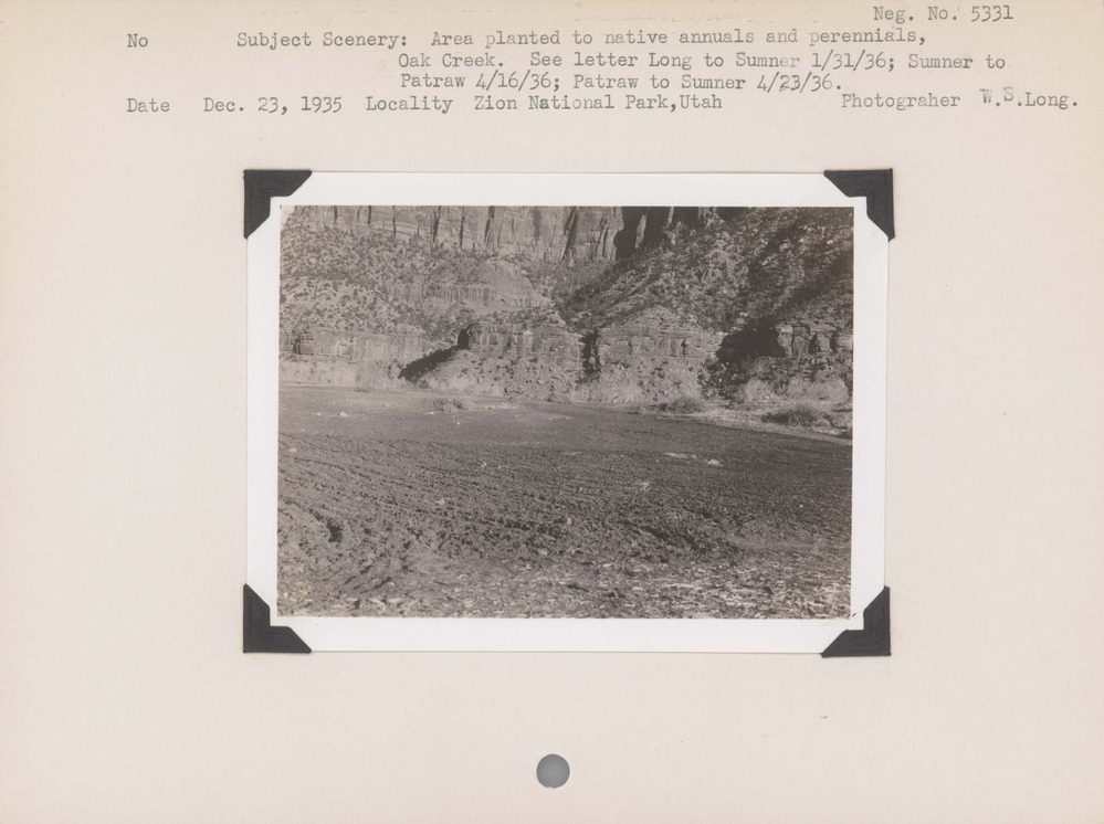 Scenery: Area planted to native annuals and perennials, Oak Creek. See letters to Sumner 1/31/36; Sumner to Patraw 4/16/36; Patraw to Sumner 4/23/36). Negative #: 5331. Location: Zion National Park.