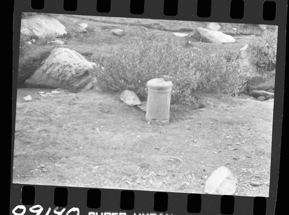 Bill Briggle, 600000, Dusy Basin, KCNP, Historic Individuals, backcountry cleanup, garbage can at campsite, possible cache container for Orland Bartholemew's 1929 ski trip.