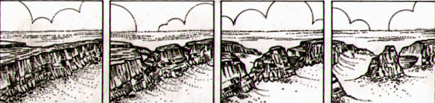 Four-part geologic diagram depicts the creation over time of Independence Monument (l-r):