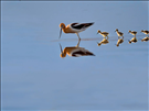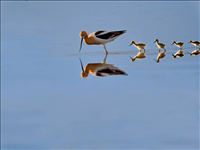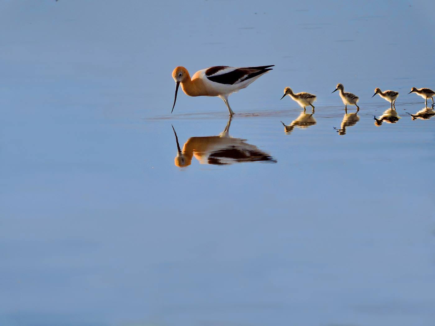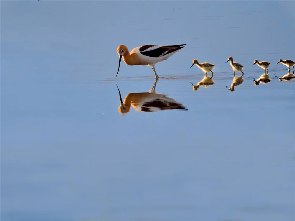 These American avocet (Recurvirostra americana) fledglings are learning from their mother how to feed in the wetland shallows. Their father is also helping rear the young. His job is to chase away other birds and animals from his family as they venture out into the world. This species lays light green speckled eggs right on the shore of the wetlands, with little to no nest material around the eggs. However, this simple nesting habit doesn't mean parents don't care for their eggs or offspring. In fact, both adult avocets will defend eggs and chicks with surprising ferocity, dive-bombing and loudly calling against intruders.