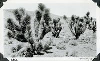 Hillside of large Joshua Trees. April 15, 1929. Photographed by Mat Roy Thompson. Inscription in black ink, lower right corner: 4-15-29. Number in black ink in lower left corner refers to historic photograph numbering system: 1866. Black and white, horizontal format, 3 x 5 inch. Corner mounted on photograph album page.