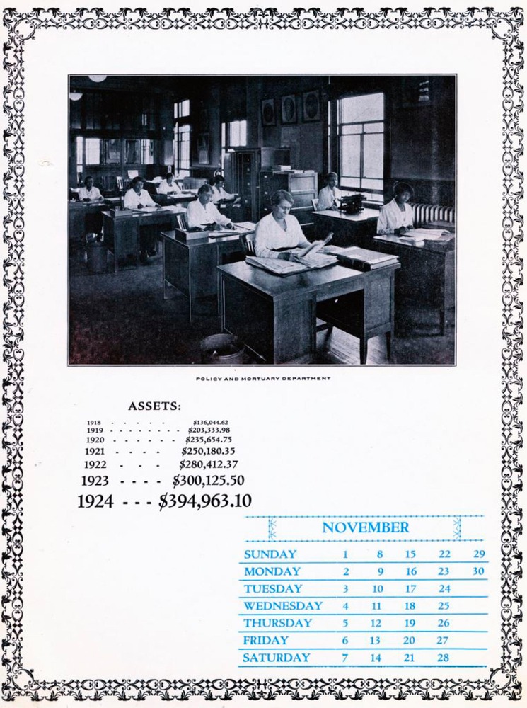 Page with decorative border contains monthly calendar printed in blue ink in vertical format. In this immage, clerks of the policy and mortuary departments work at individual desks, one using a typewriter. All of the women clerks wear required white blouses. The ledgers seen are part of the archival collection at the Maggie L. Walker National Historic Site.