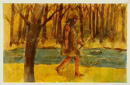 Tlingit walking along a stream bank.