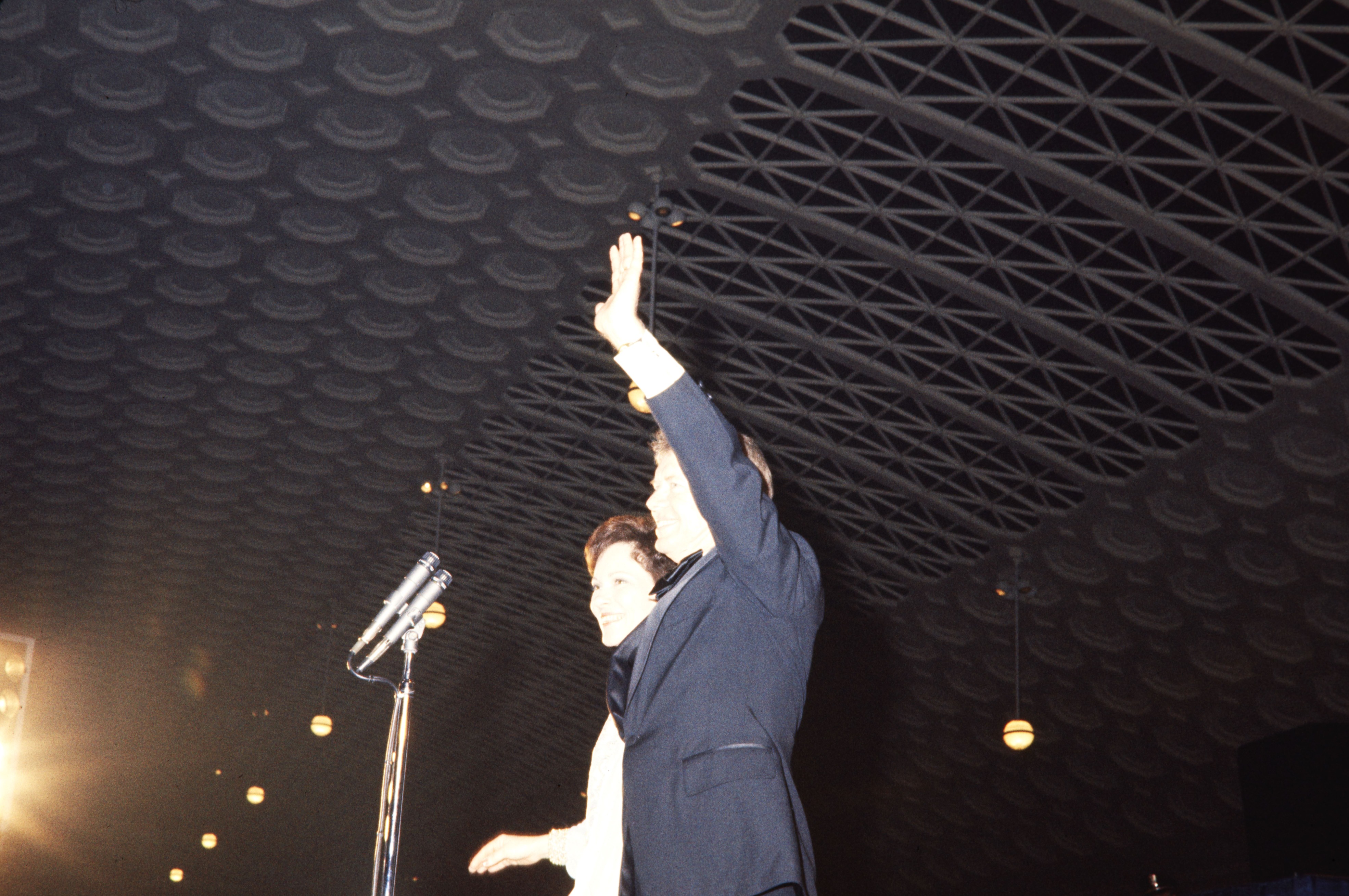 President Jimmy Carter and First Lady Rosalynn Carter waving.