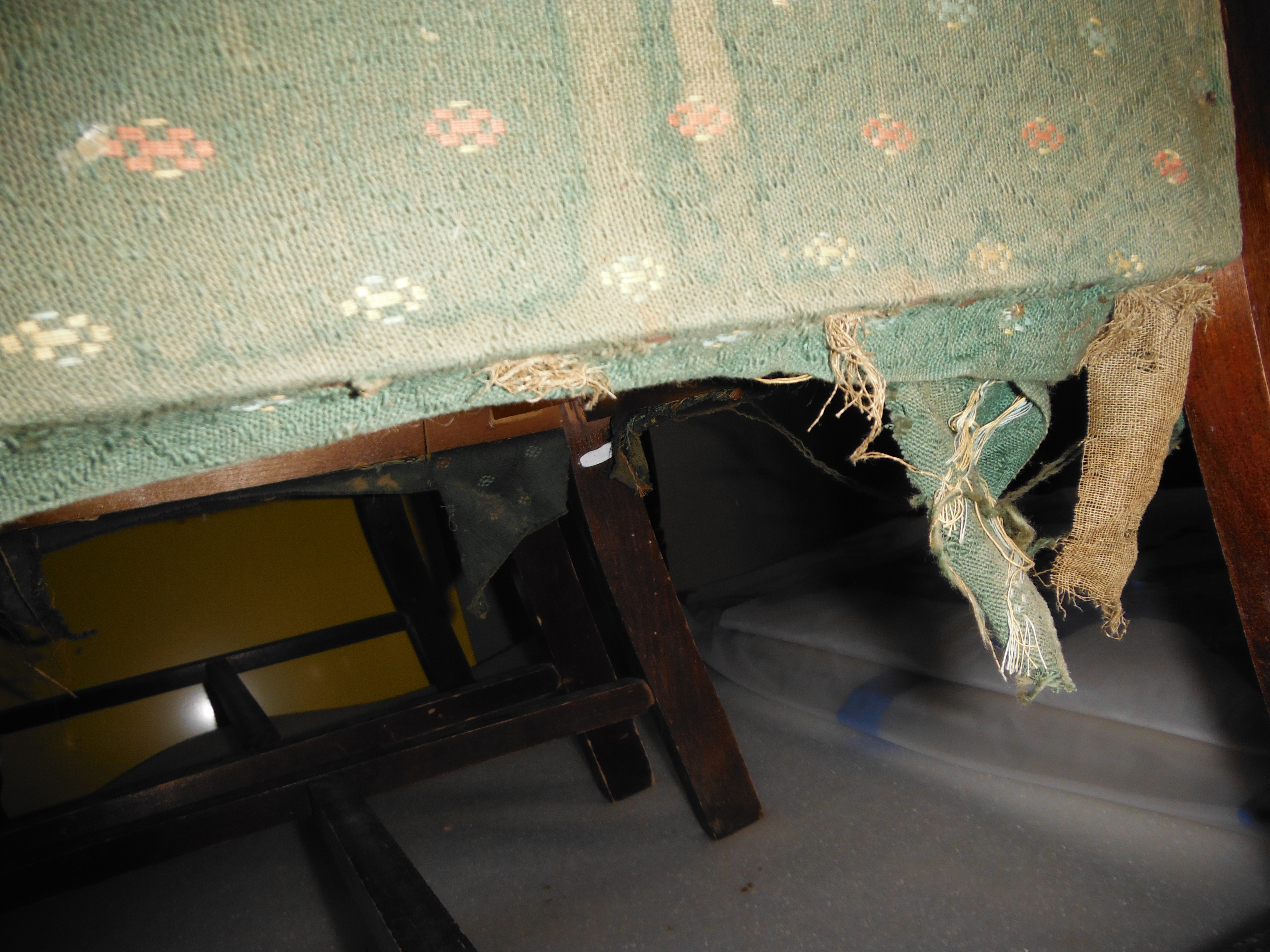 This historic chair was stored in the Stables at Scotty's Castle, which has been used for museum collection storage. While it was in storage, a rodent nested in it, and this damage can be seen.