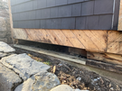 The base of a dark brow stained shingle sided wall with lower shingles stripped away to reveal the wall underneath made of bare boards slanted downward from left to right. Below that, rotten framing boards and beams are visible and are in the process of being replaced. The top of a stone retaining wall is visible crossing the bottom right quarter of the frame from top left to bottom right, parallel to the wall.