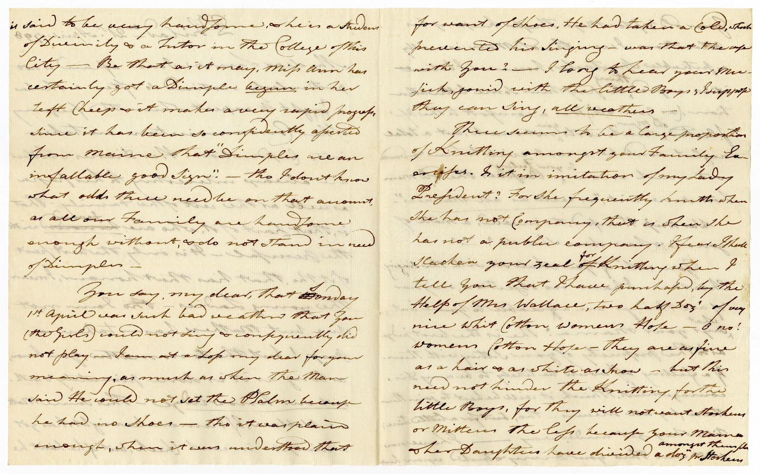 Philada 21st. April1798 My dear Lucia, I am afraid is not particularly noticed so often as she has a right to expect. When the frequency of her Communications are taken into Consideration. Her Diaries & Letters are always interesting to her papa as well as the rest of the Family – that is, that part of it, who are honour’d ^favoured with the penisal[sic] – it is only the best part of it tho, that has the honour, I mean the young Ladies – tho I am not sure but Mathew has – taken a peep! but that’s no matter, you know, as long as it is done privately & with-out our knowledge – This same Math-ew Wallace, If I remember right, has got a dimple in each Cheek, but if he han’t[sic] he (p. 2) is said to be very handsome, & he is a student of the Divinity & a Tutor in the College of this City – Be that as it may, Miss Ann has certainly got a Dimple begun in her left Cheep[sic] & it makes a very rapid progress, since it has been so confidently asserted From Maine that “Dimples are an infallable[sic] good sign.” – tho I don’t know what odds there need be on that account, as all our Family are handsome enough without, & do not stand in need of Dimples – You say, my dear, that MSonday[sic] 1st April was such bad weather that you (the Girls) could not sing & consequently did not play – I am at a loss my dear for your meaning, as much as when the Man said He could not set the Psalm because he had no shoes – tho it was plain enough, when it was understood that (p. 3) For want of Shoes, He had taken a Cold, which prevented him singing – was that the case with You? – I long to hear your mus-ick[sic] join’d with the little Boys, I suppose they can sing, all weathers – There seems to be a large proportion of Knitting amongst your Family Ex-ercises. Is it in imitation of my Lady President? For she frequently knitts[sic] when she has not Company, that is when she has not a public company. I fear I shall slacken your zeal of ^for Knitting when I tell you that I have purchased, by the Help of Mrs Wallace, two half dozn of my nice Whit Cotton womens Hose – O no! Womens Cotton Hose – they are as fine as a hair & as white as snow – but this need not hinder the Knitting for the little Boys, for they will not want stockens[sic] or Mittens the less because your Mama & her Daughters have divided a dozn pr Stockens ^amongst themselves (p. 4) Your old Visitor Major Thrasher keeps up his attention I see – the old man is really a pitiable Spectacle, however I believe it is a good ^thing to pay him some little atten-tion, (as you do,) It is a comfort to the Af-flicted ^old man, which costs ^you not much; but a total neglect would be a real evil to him & would cost much more ^to your Feelings. Besides the old man has some wit, “as well as all manners.” Was Miss Hanford, the invalid, a mate of yours? & how does She do? – You ask “If you shall sit with the singing Choir” - I have no objection, my Dear if all things are agreable to you – but ^what says your Mama? She is the best judge as to the propriety of your sitting with them. If a falling off would be likely to be any Dis-couragement, I think it will be best to join them there, by all means – tho, but for a little time; till they get underway – I have now just run thro your Diary & touch’d upon here (p. 5) & there a line; which has taken up the usual pages of a Letter, tho I think it generally most entertain-ing. (when a special answer is not as ne-cessary) to give Anecdotes & observations of things about us, when we are dis-tant from our Correspondents, rather than to spend many Observations on those things communicated to us – The latter leads us abroad, in imagination, in quest of Novelty; & the former leaves us at home, where we have the same story over & over again – Apropos – It is Saturday in the afternoon, there is no Congress, nor School, & the Weeks Work is over, consequently. I have the honour & the pleasure of seeing sitting in my Chamber here & there whilst I am writing this scroll All the younger part of the Family. Miss Edith (p. 6) & Rebecca are each sitting by the table with a Magazine in their hands – perusing them very demurely & little thinking that I am engaged in making any Observations on their Acct. Miss Ann sitting on the foot of the bed sewing her white gloves, such as are usual when a young Lady becomes a bride. Polly standing by the window reading, David looking over Miss Edith’s shoulder, tho I have often ^before told him not to do it. Robert & Marga-ret are rather noisy about the room playing with a little black turtle about as big as a dollar – the little young thing puts out his head & runs & creeps to their great diversion – (Children don’t make seashon ^quite so much – Noise, if you please) Add to this a brisk April Shower abroad with thunder & Lightening mix’d with hail, (p. 7) pattering on the Roof of the Kitchen before my window & you have a view of your papas as He sits scribling[sic], with his new Coclico Strip’d Silk Gown, put on this Afternoon for the first time, because the weather is warm – Miss Edith made my Gown & it suits nicely – Ay, & she has got her trade too, as nicely; for in making up the Piece, only two Gowns, one for Mathew & the other for myself, She has, by dint of the Art made & saved Cabbage enough to make herself a short gown or what ever it may be called – Who could have thot there had been so much Art in so plain a piece of Work!!! - Ladies, what do you find in the magazines -? Miss Duffield is married – nothing else? I was only looking of ^for the Marriages! So you see my dear Lucia how it is Adieu – PW.
