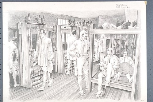 Scene shows the interior and related activities of Fort McHenry's Enlisted Men's Barracks.