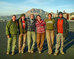 A group of six young men and women pose for a photo in a parking area, backed by a large gray mountain.