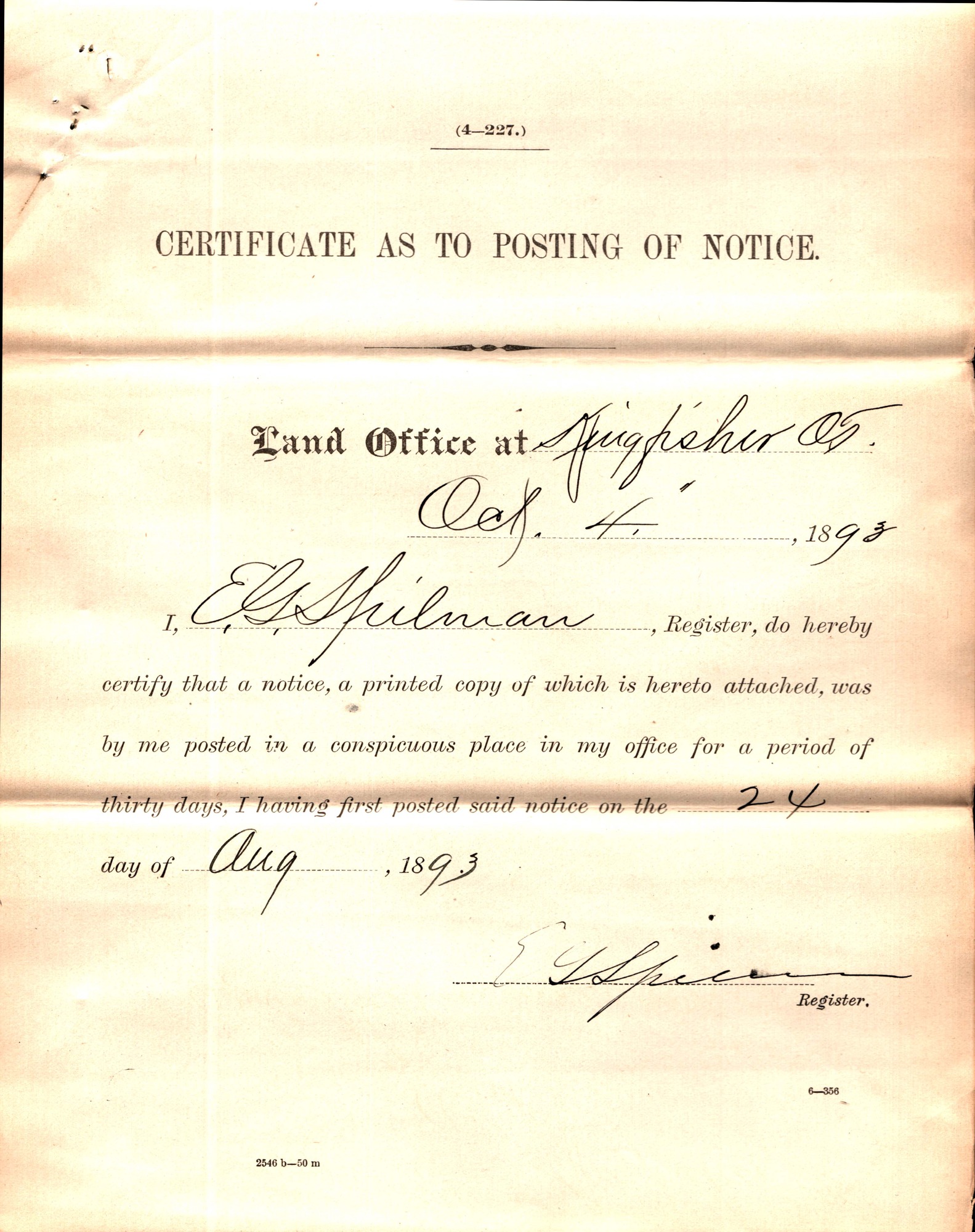 I, E.G. Spilman, Register, do hereby certify that a notice, a printed copy of which is hereto