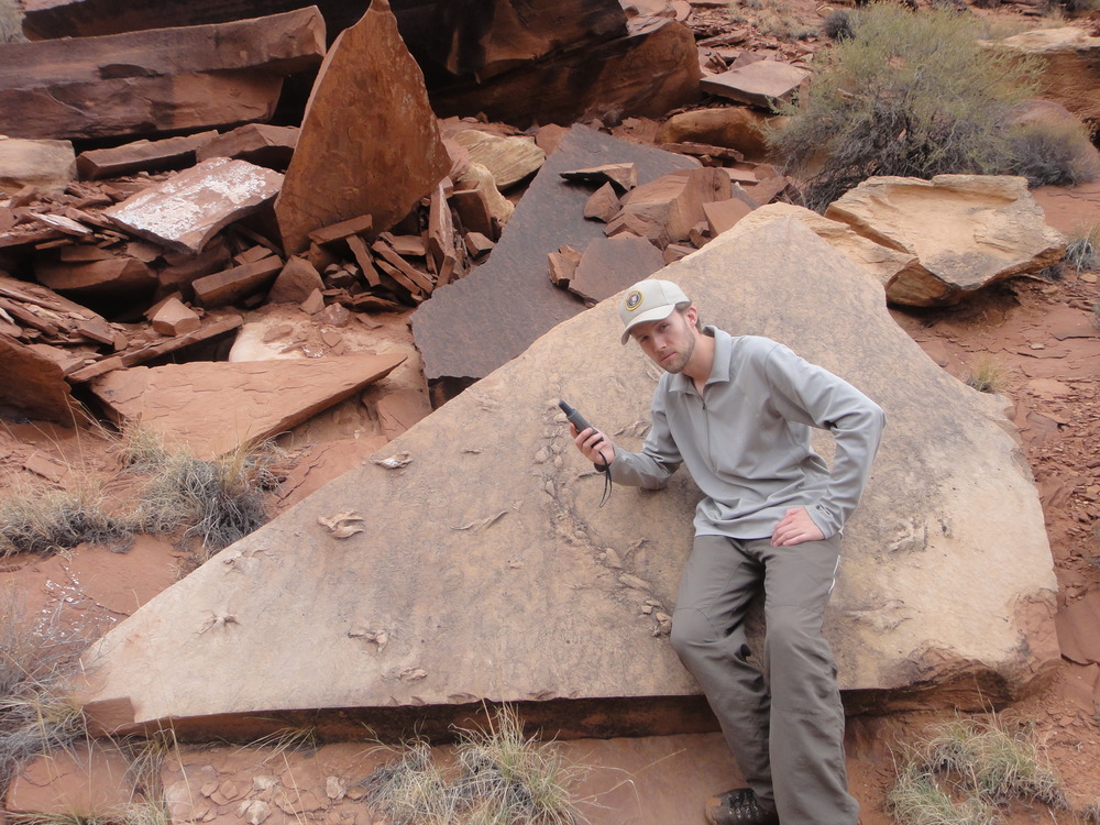 GIP Derek Raisanen at Capitol Reef National Park, Utah, taking GPS coordinates on a block containing Triassic reptile tracks.
