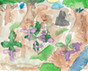 Watercolor painting of purple flowers on the ground with trees in the background.