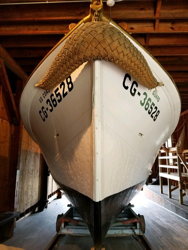 The bow of the boat with a rope fender (bumper) on the nose. Written on either side: US Coast Guard CG-36528