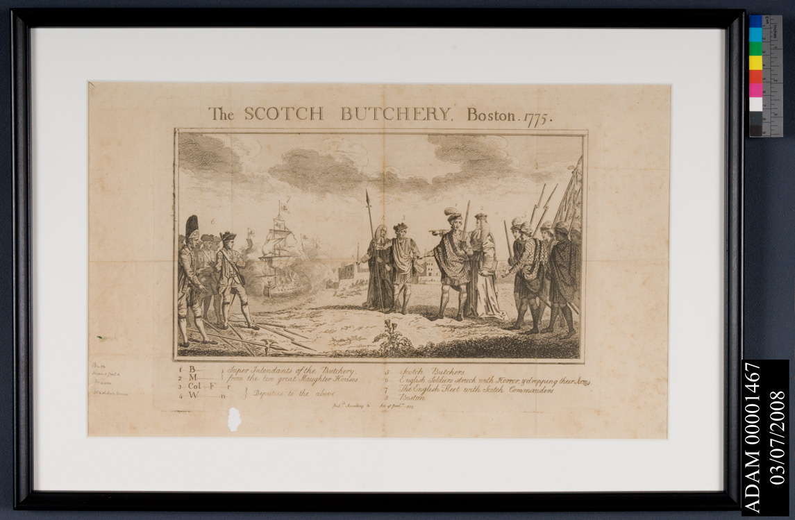 Historic Furnishings Report Vol VI pp 580: Historical Information taken from Henry Adams II notes: 1. William, Lord, Blute. 2. William Murray, Earl of Mansfield. 3. Colonel Frazer. 4. Alexander Wedderburn, Attorney General. Scotch Butchery 1775. To compel Boston to pay for the Tea destroyed and comply with Duties, the Boston Port Bill was passed in 1774. By this act Boston was blockaded till ut should submit. In the first part of 1775 there was much suffering as all trade had ceased and supplies had to be brought in from the land side, but the citizens still held out. In England the friendly element laid the entire blame for the coercion of the Colonies to the influence of Scotch ministers and Scotch Colonial officials. Rumors came to London that citizens had been fired on and Boston bombarded. The cartoon shows such an imaginary incident. The city in the background is probably Quebec which under the Port Act was not coerced like Boston.