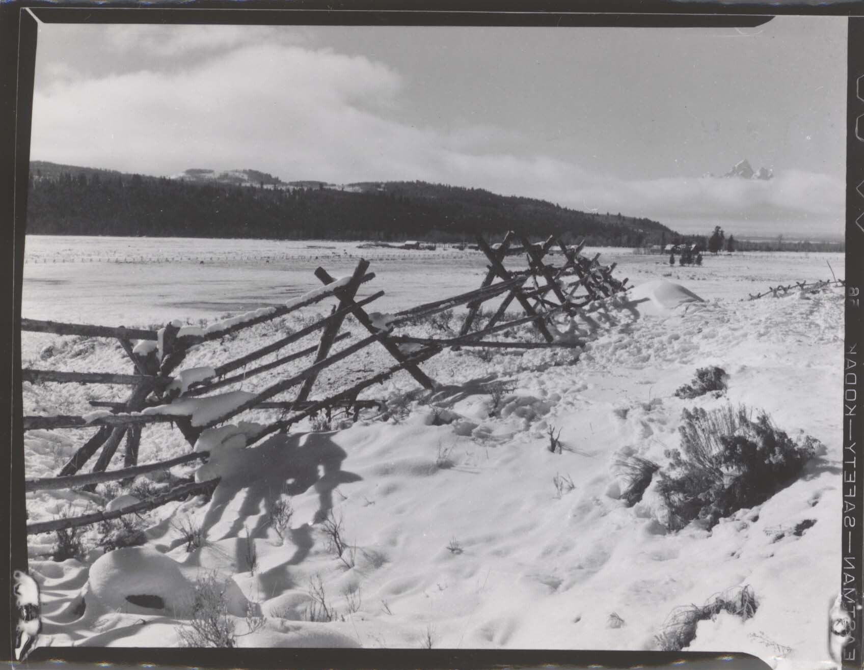 Snake fence partly knocked down by migrating elk. Cockrell Ranch (in center rear) about one mile west of Neil's Store. Top of Grand Teton in right distance. Locality: Jackson Hole National Monument [Grand Teton National Park]. Negative #: 11169